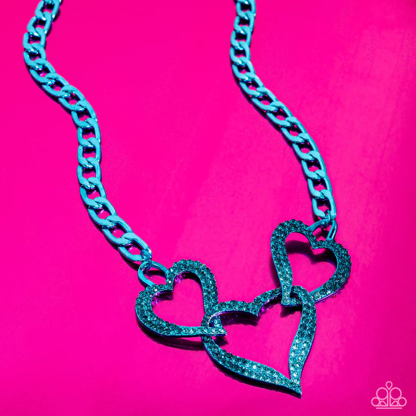 Cascading from an electric blue curb chain, a trio of rhinestone-embellished hearts featuring an ombré effect of blue to aquamarine shimmers and shines around the neckline for a seasonal statement. Features an adjustable clasp closure.