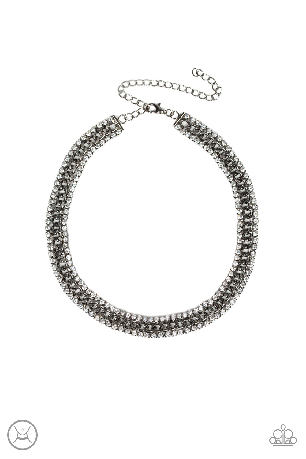 Featuring sleek square fittings, strands of glittery white rhinestones flank a glistening gunmetal chain, coalescing into a regal look around the neck. Features an adjustable clasp closure.
