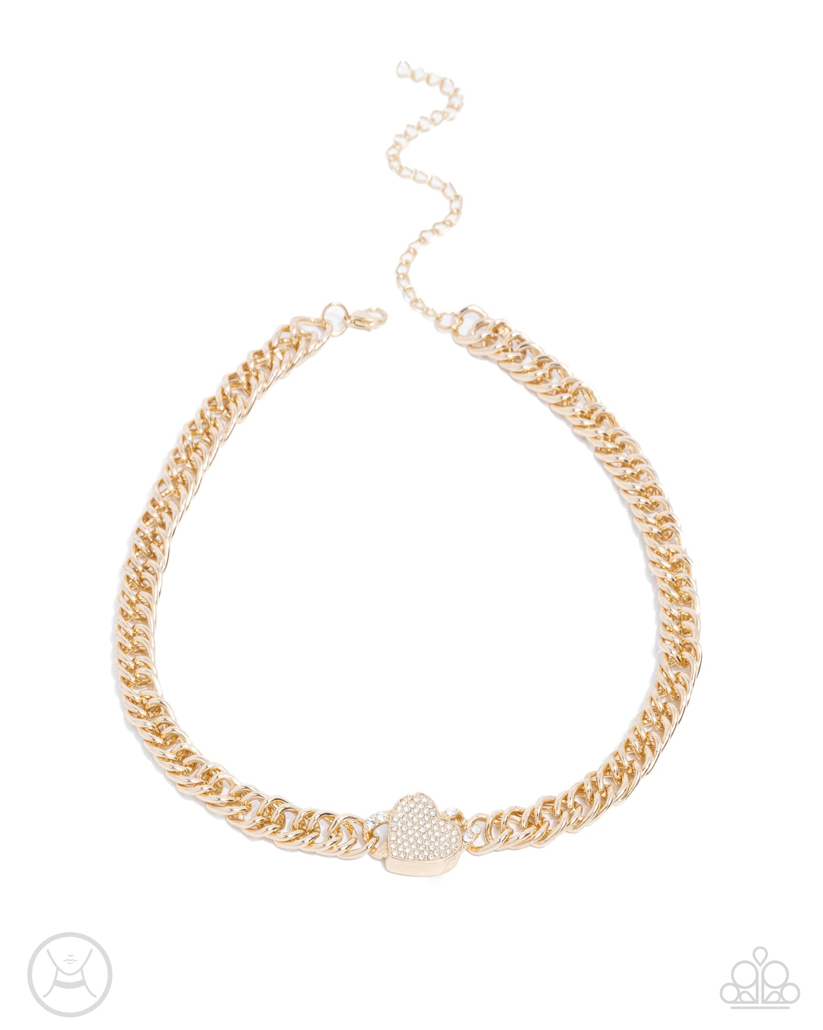 Featuring rhinestone-embellished gold links, a dramatic white rhinestone-dusted tilted gold heart glitters at the center of bold refined chain links, resulting in a flirtatious sparkle around the neck. Features an adjustable clasp closure.