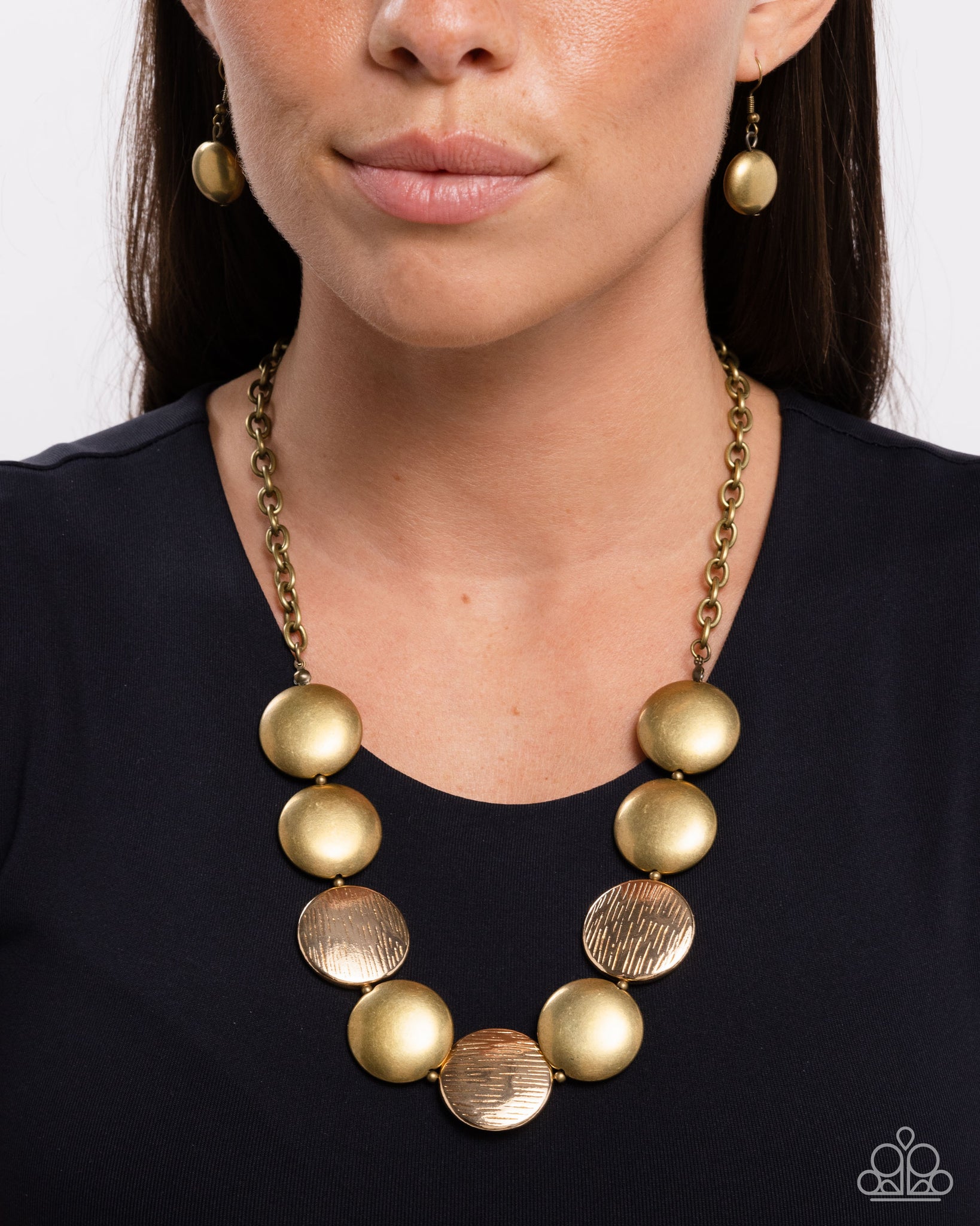 Cascading from an antiqued brass chain, a collection of glistening oversized gold discs and linear-textured brass discs loop below the neckline for a monochromatic masterpiece. Features an adjustable clasp closure.