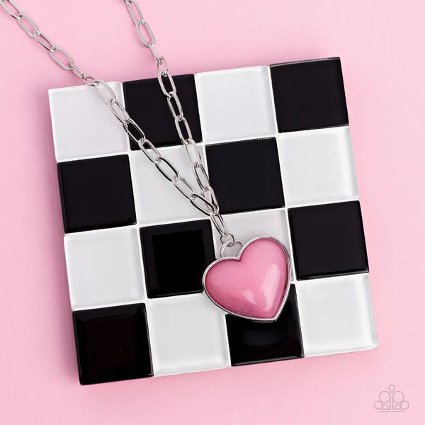 Chiseled into a charming heart, a rose quartz-like gemstone is pressed into the center of a silver fitting at the bottom of a silver oval chain for a sentimental statement. Features an adjustable clasp closure.