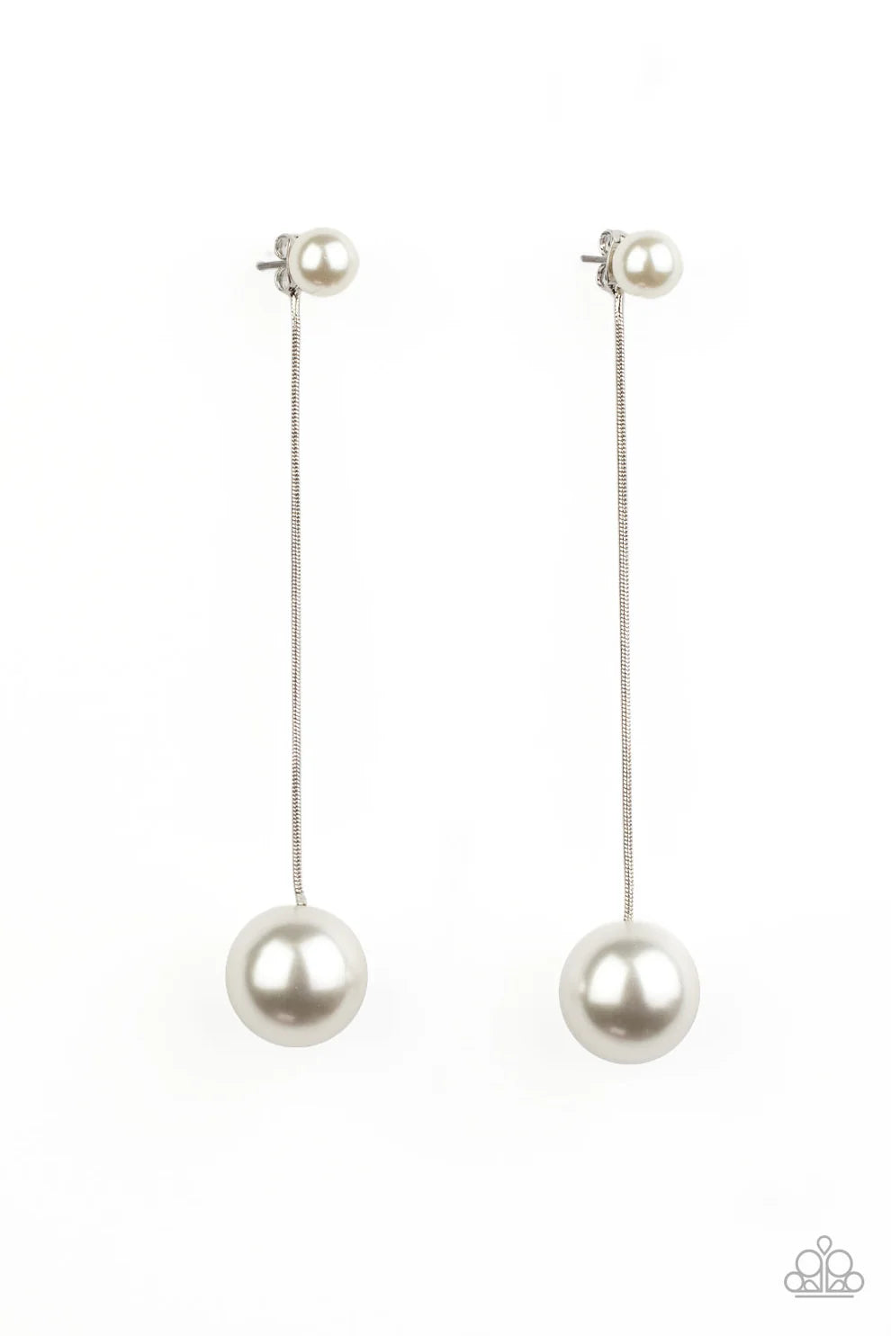 Attached to a sleek silver chain, an oversized white pearl delicately swings from the bottom of a classic white pearl, adding a timeless twist to the elegant display. Earring attaches to a standard post fitting.