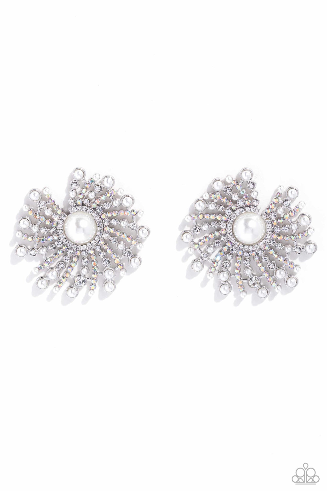 Shimmery strands of silver spin out from a white pearly center, creating an exaggerated firework-like display at the ear. An explosion of dainty iridescent rhinestones, dainty white pearls, and white rhinestones lines the swirls and curves of the shimmery display, creating an eye-catching display. Earring attaches to a standard post fitting. Due to its prismatic palette, color may vary.