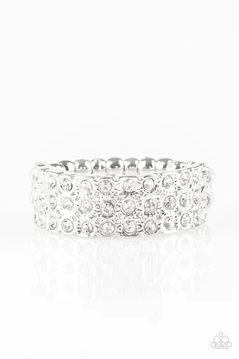 Row after row of dazzling white rhinestones are encrusted along a dainty silver band, creating timeless shimmer. Features a dainty stretchy band for a flexible fit.