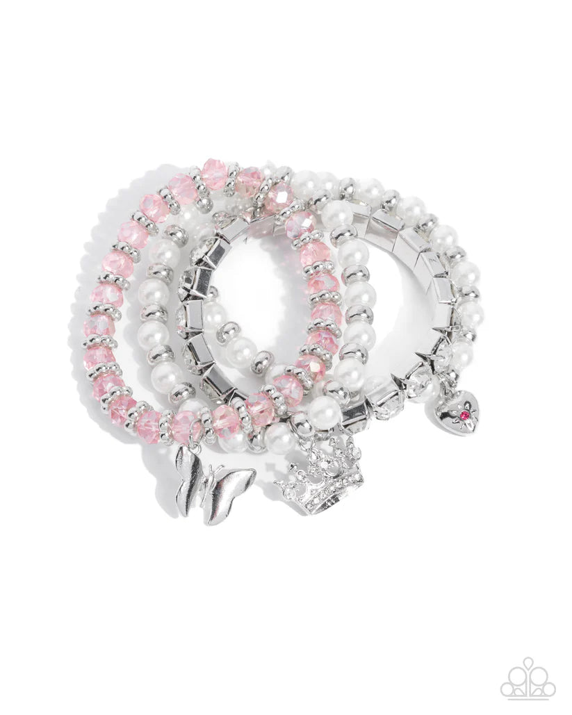 Infused along elastic stretchy bands, a glistening stack of four bracelets featuring silver wheel beads, silver discs, white pearls, white rhinestones in thick silver square fittings, and faceted glassy pink beads with a subtle UV shimmer are adorned with a silver butterfly, white rhinestone-encrusted crown, and rose rhinestone-centered floral heart, creating soft, charming layers around the wrist.