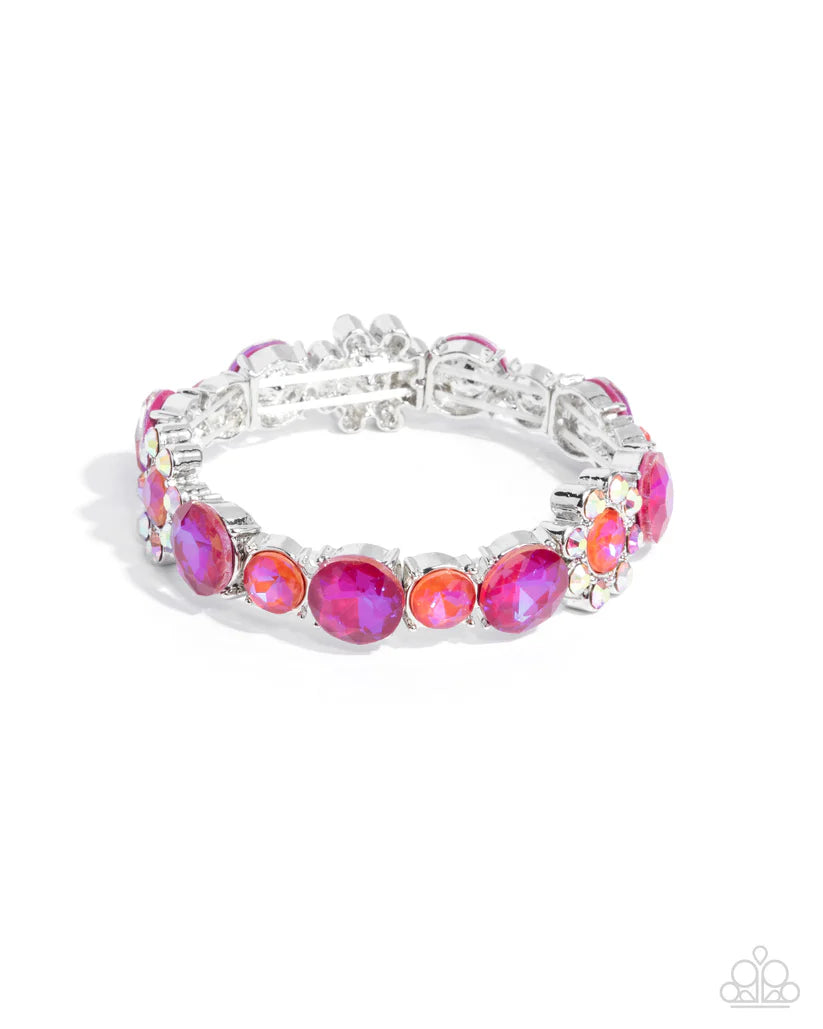 Dotted with iridescent rhinestones, a collection of round UV light peach and UV fuchsia gems link across the wrist. The oversized rhinestones are sprinkled with smaller accents to create a dazzling floral motif. Features a stretchy band for a flexible fit.