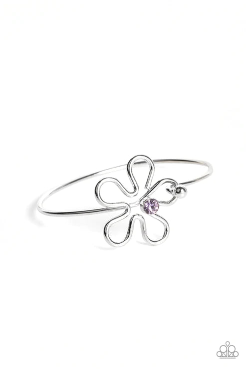 Dotted with a sparkly purple rhinestone center, shiny silver bars curve into a floral frame atop a dainty silver bangle around the wrist. Features a pronged closure.