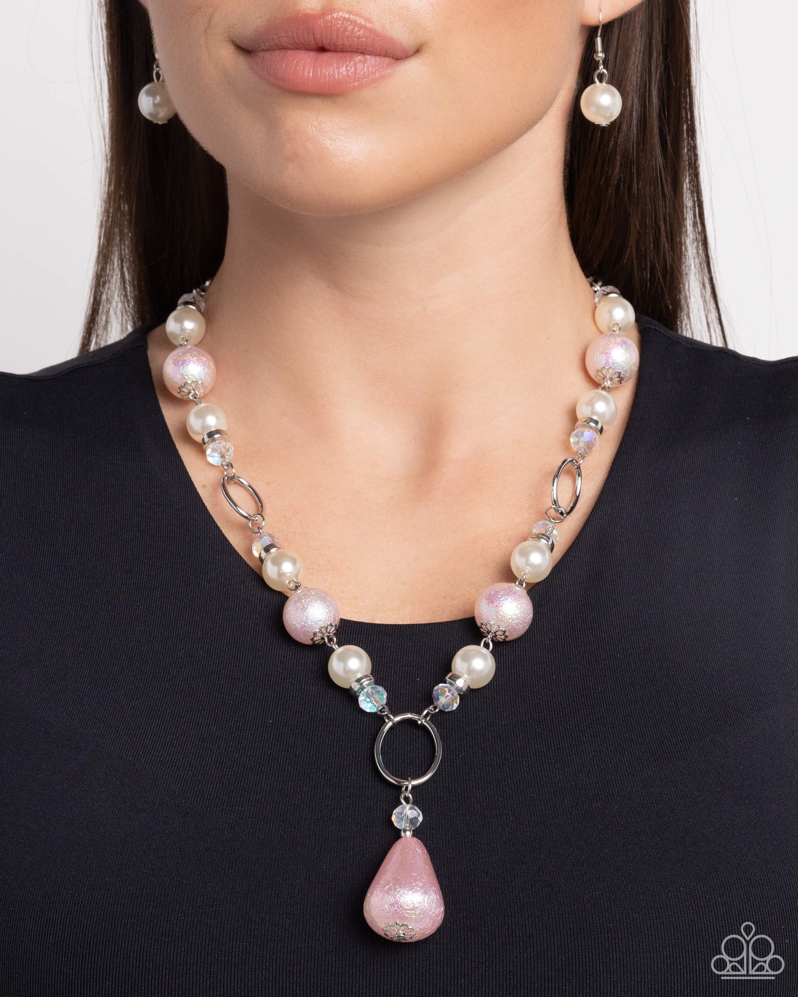 Brushed in iridescence, a collection of foiled baby pink beads alternate with glossy white pearls, silver rings, faceted clear beads, and silver oval hoops along the neckline leading the eye to an elongated foiled baby pink iridescent teardrop bead for a fairy tale-inspired pop of color. Features an adjustable clasp closure. Due to its prismatic palette, color may vary.