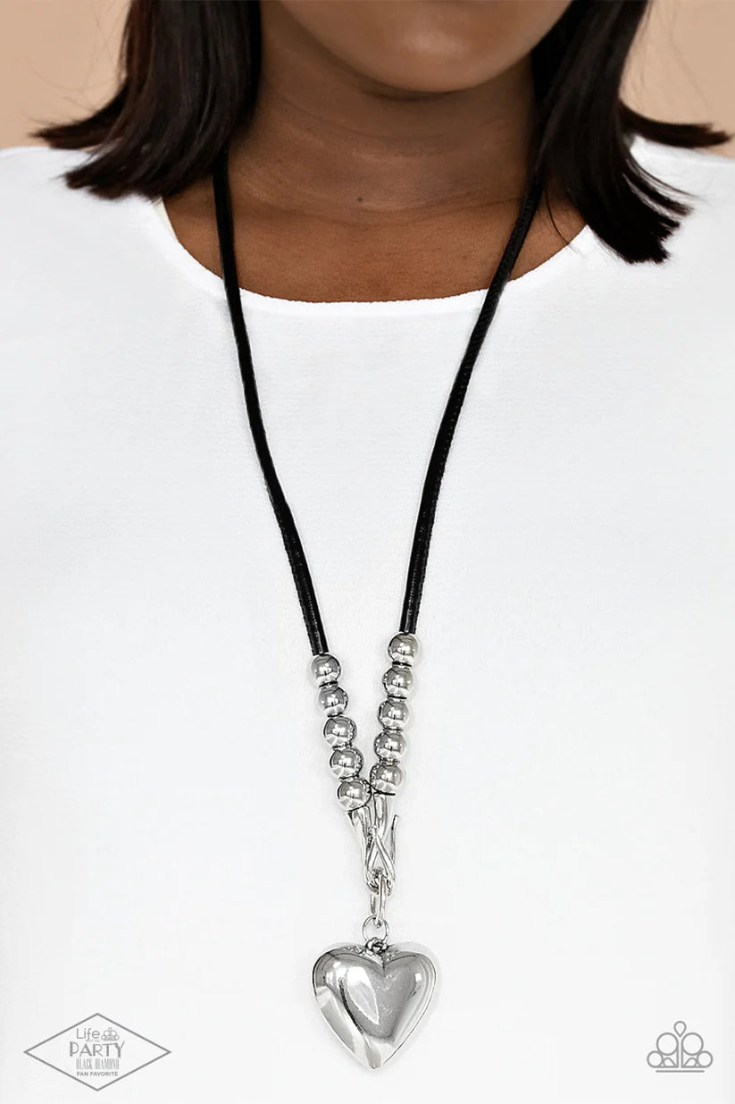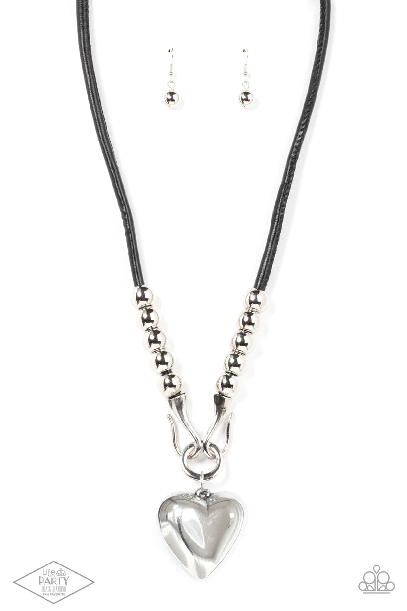 Featuring chunky silver beads, an oversized silver heart pendant swings from dramatic silver hook-like fittings that attach to a bold leather cord draped across the chest for a haute heartbreaker look. Features an adjustable clasp closure.