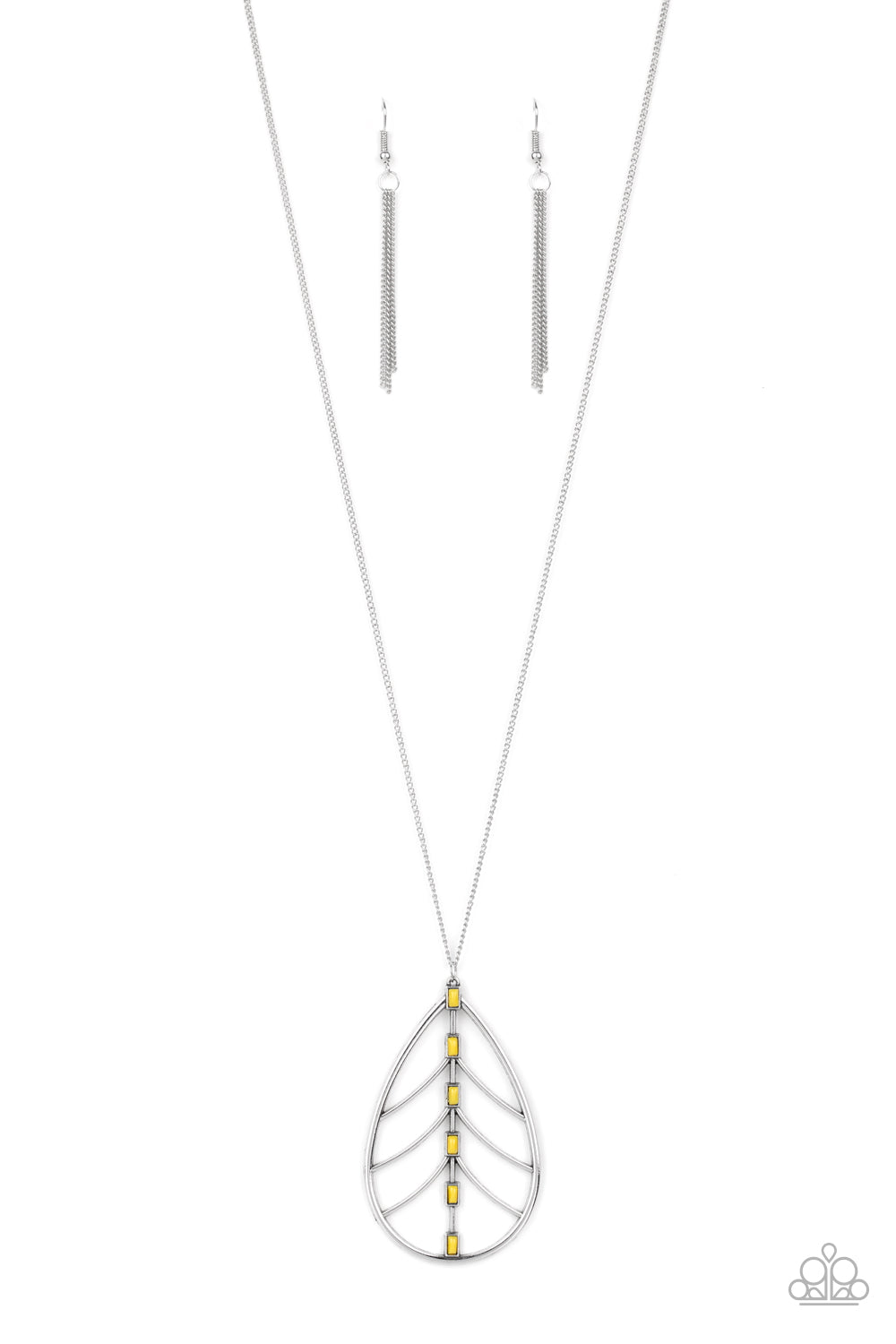 Dotted with rectangular yellow beads, an airy silver leaf pendant swings from the bottom of a lengthened silver chain for a seasonal look. Features an adjustable clasp closure.