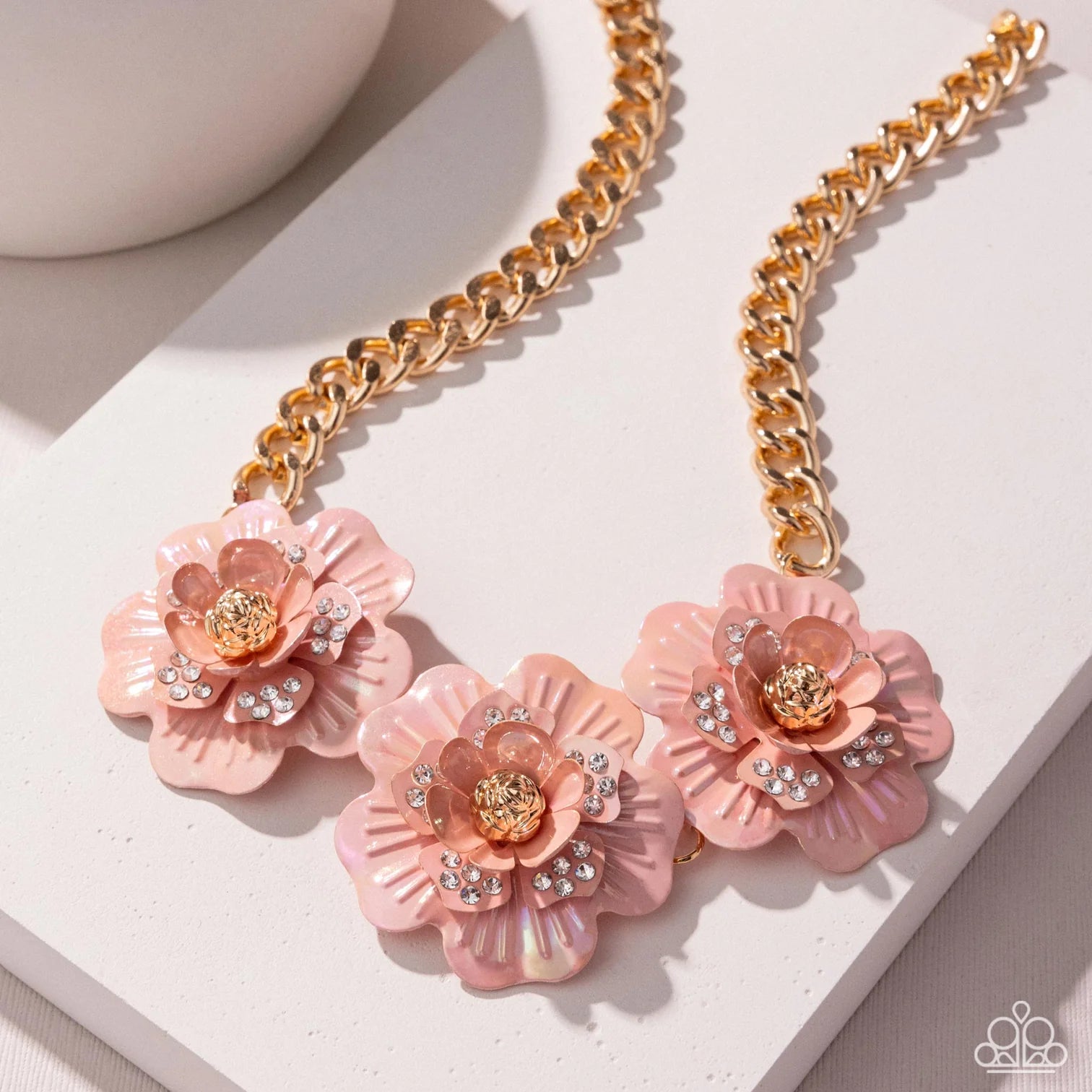 Featuring gold rosette centers, a trio of iridescent-brushed pink flowers whimsically bloom in a three-dimensional display below the neckline from a gold curb chain. Dotted across the middle-most petals, a collection of white crystal-like rhinestones glimmers for additional eye-catching detail and shimmer. Features an adjustable clasp closure. Due to its prismatic palette, color may vary.