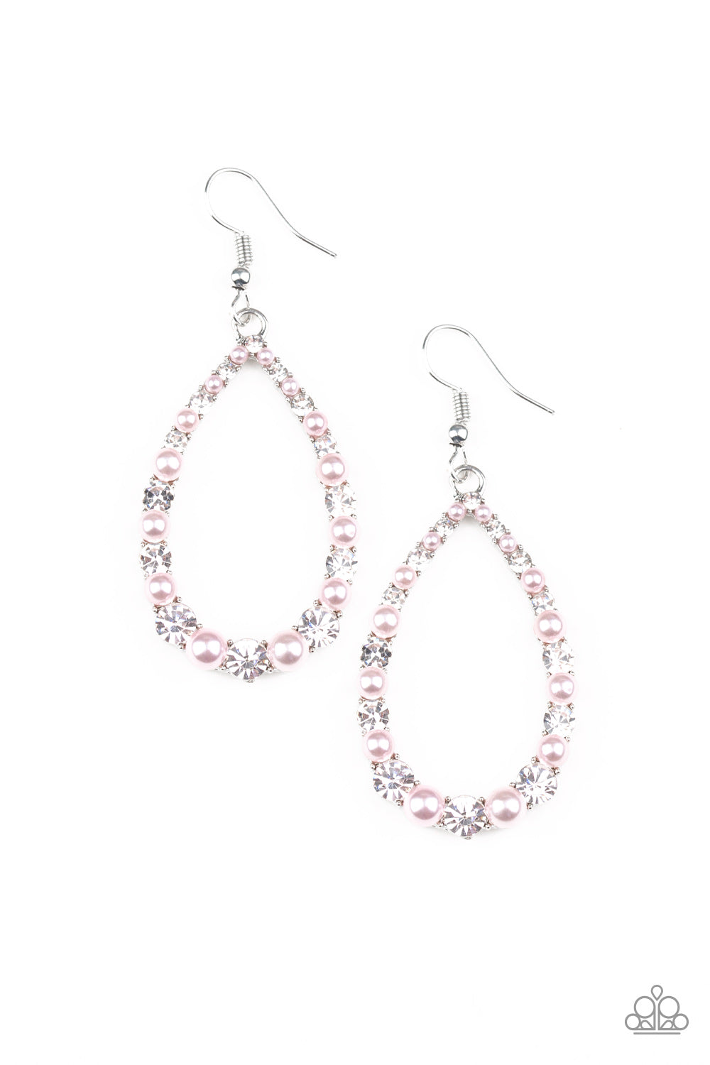 A collection of pink pearls and glassy white rhinestones are encrusted along an airy silver teardrop for a timeless look. Earring attaches to a standard fishhook fitting.