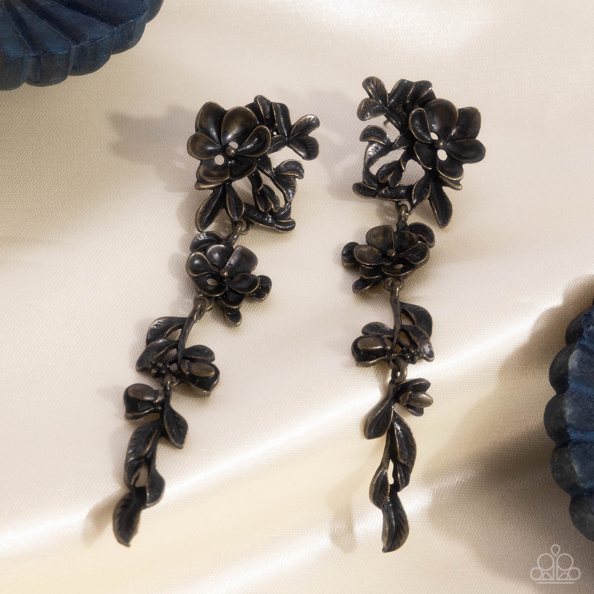Dipped in an antiqued brass shade, a bouquet of various brass flowers and leaves collect at the ear, slowly cascading below the ear in solitaire floral collections that interlock and elongate the neckline for a whimsical design. Earring attaches to a standard post fitting.