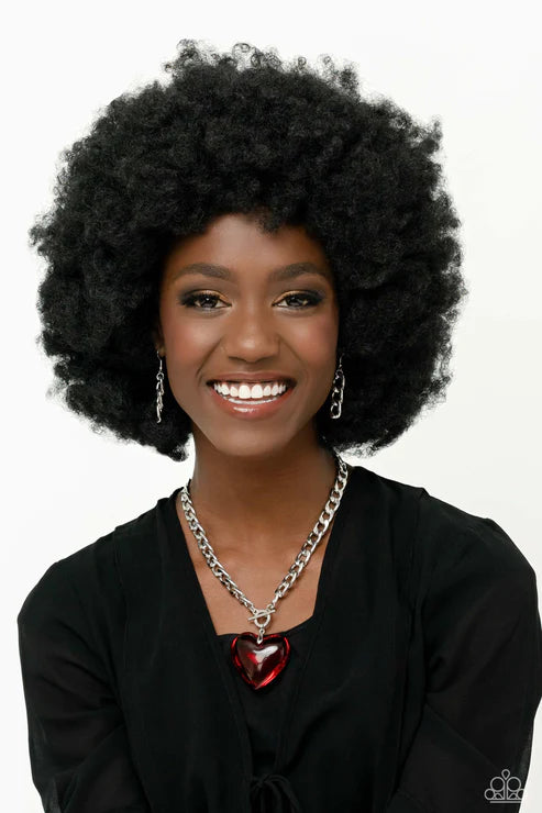 Featuring a glossy finish, an oversized, rich, red heart gem swings from the bottom of a thick silver curb chain below the collar for a romantic declaration. Features a toggle closure.