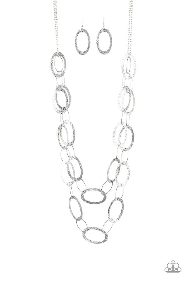 Delicately hammered in shimmery textures, two rows of glistening silver hoops layer down the chest for a sleek look. Features an adjustable clasp closure. Sold as one individual necklace. Includes one pair of matching earrings.