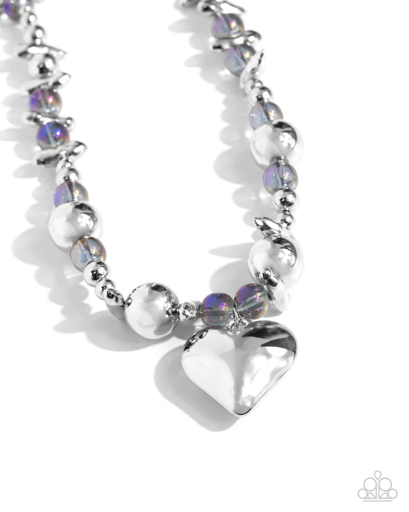 Infused along an invisible string, a collection of silver beads in varying sizes, chiseled silver pebbles, and transparent purple iridescent beads loop around the neckline for a glistening display of color. An oversized silver heart pendant swings from the center of the display for a light-hearted finish. Features an adjustable clasp closure. Due to its prismatic palette, color may vary.