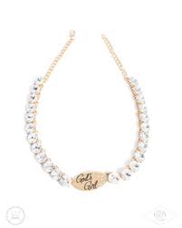 Infused along a classic gold chain, a flashy collection of gold-pronged white gems shimmer and shine down the neckline to an oval gold plate. The phrase "God's Girl" is stamped in a curly font on the plate beside a dusting of dainty white rhinestones for an inspirational finish. Features an adjustable clasp closure.