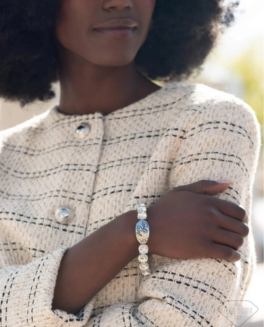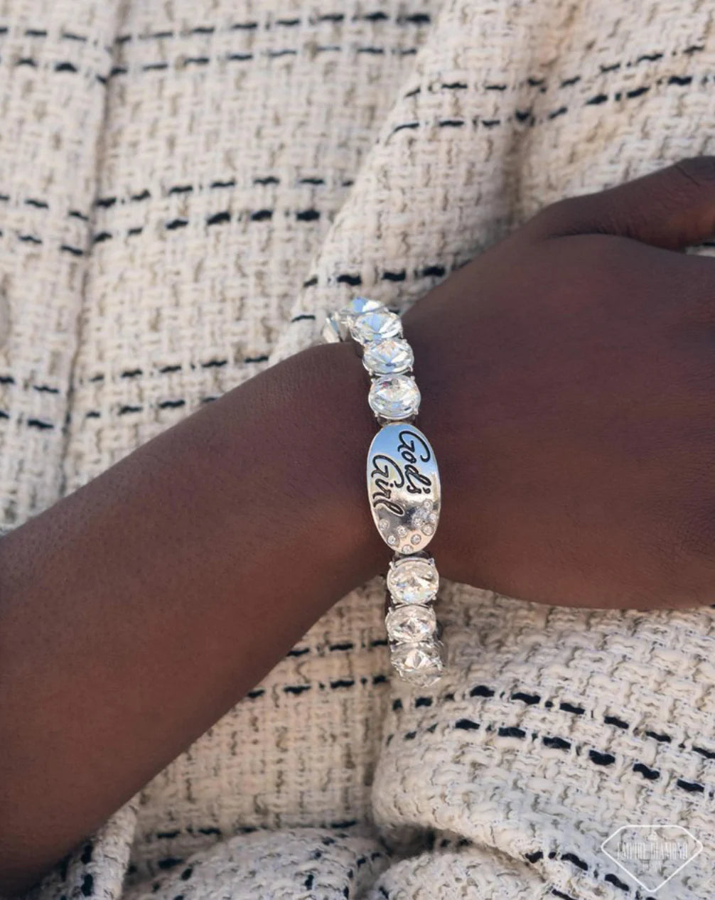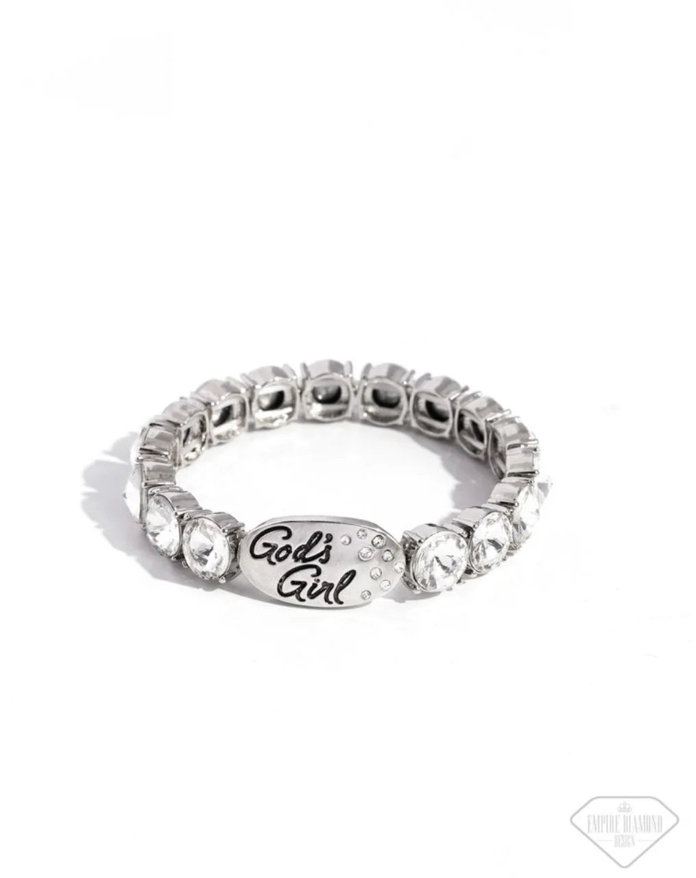 Infused along an elastic stretchy band around the wrist, pronged silver fittings featuring white gems glitter and glisten. An abstract silver oval pendant featuring dainty white rhinestones and the words, "God's Girl" creates an elegantly ethereal look.