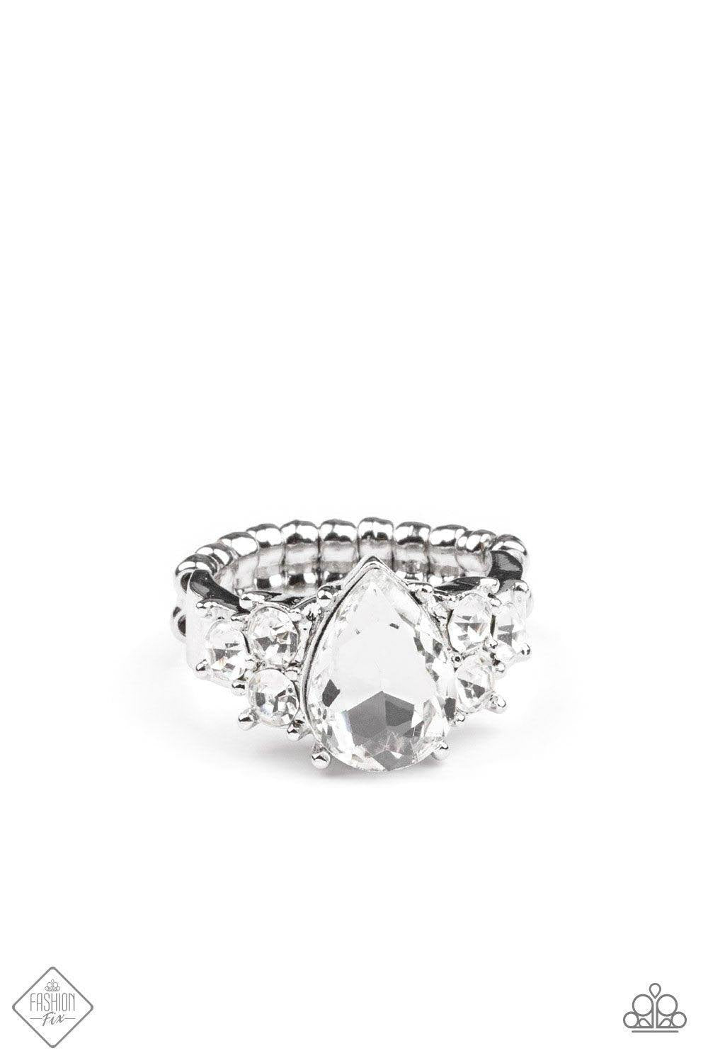 Trios of glassy white rhinestones flank an oversized white teardrop rhinestone, creating a sparkly centerpiece atop a dainty silver band. Features a dainty stretchy band for a flexible fit.