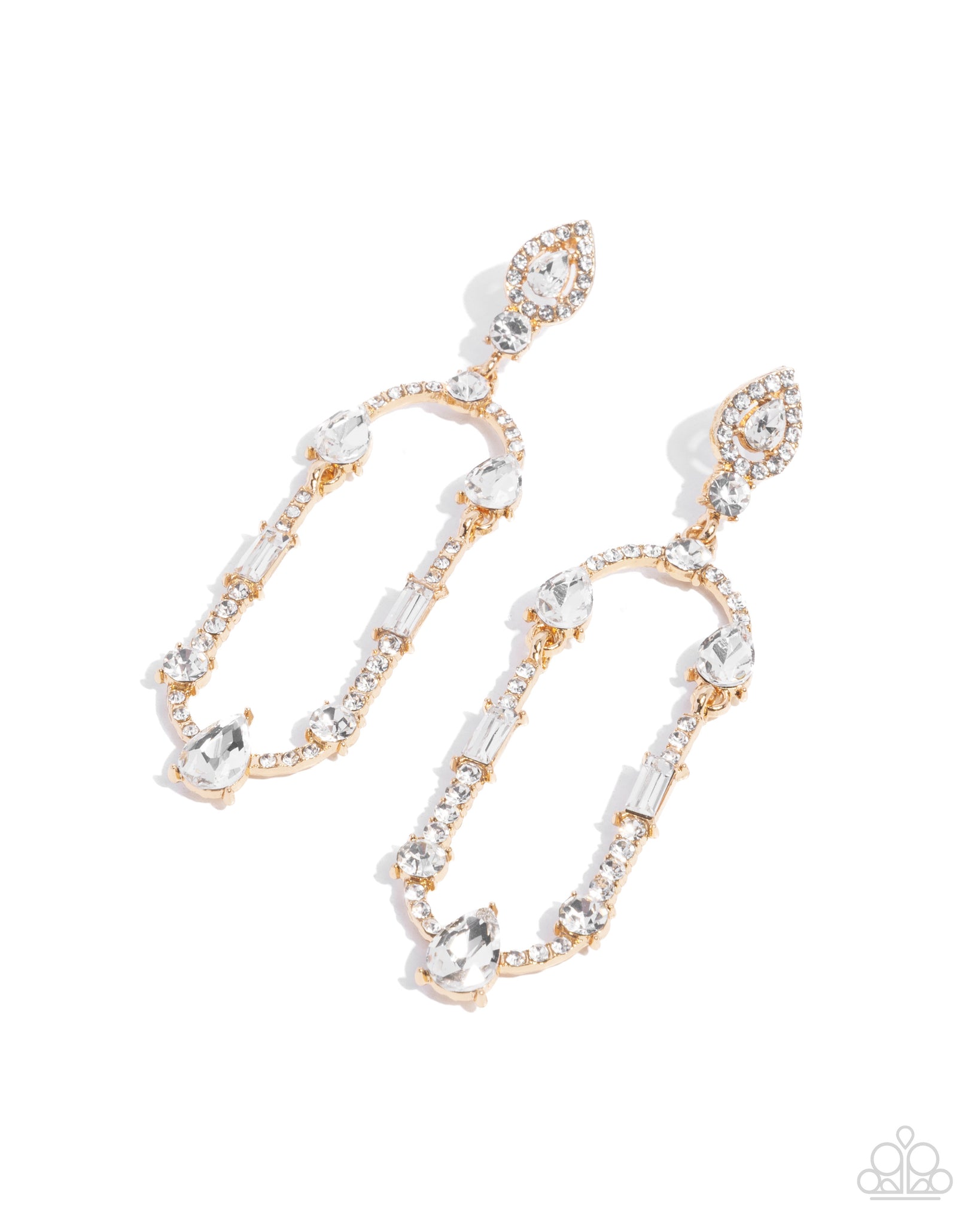 Pronged and suspended along the center of an airy white rhinestone-encrusted gold teardrop frame, a faceted white teardrop gem glistens along the ear giving way to a solitaire white round gem. A rounded cylindrical hoop, also embellished in glistening white rhinestones, pronged white gem teardrops, and pronged emerald-cut gems cascades below the teardrop post, creating an unforgettably refined lure. Earring attaches to a standard post fitting.