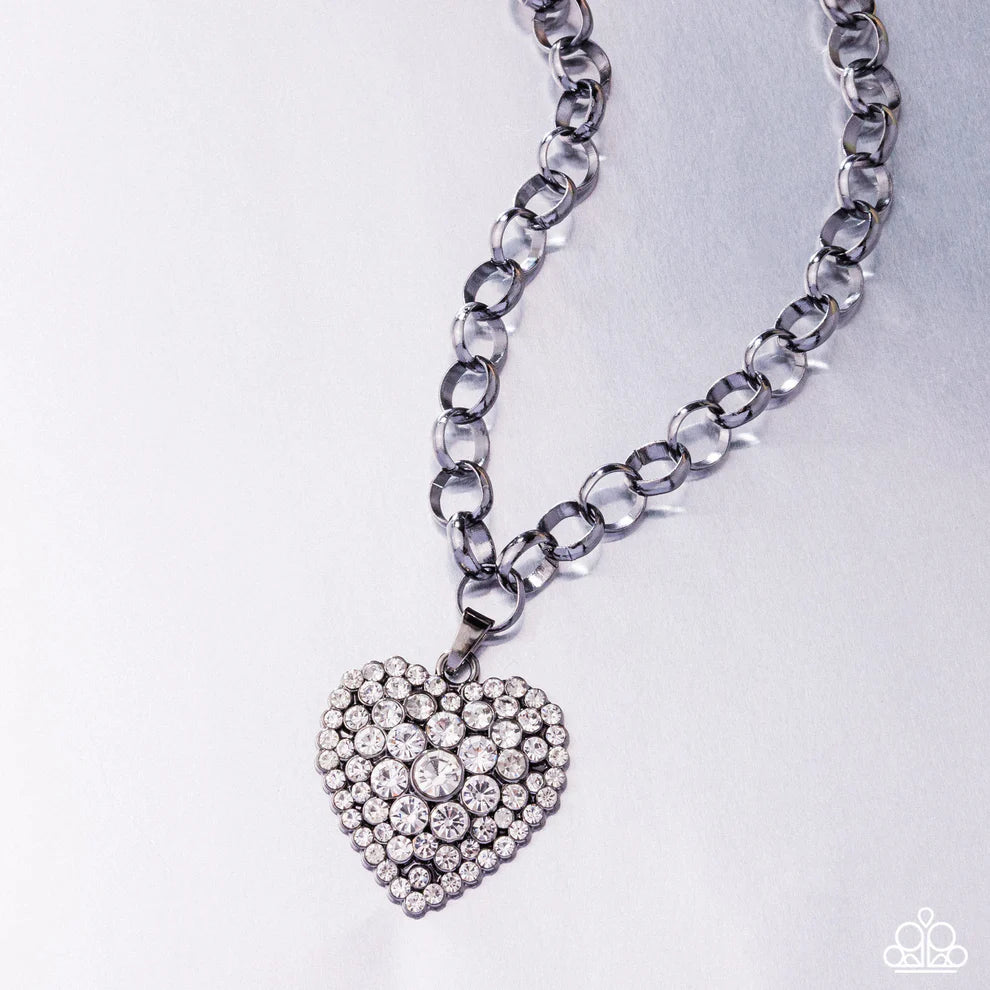 A cluster of dazzling white rhinestones creates a glamorous heart-shaped pendant that swings from oversized gunmetal links, creating a bold and radiant design. The brilliant white rhinestones gradually increase in size as they reach the center. Features an adjustable clasp closure.