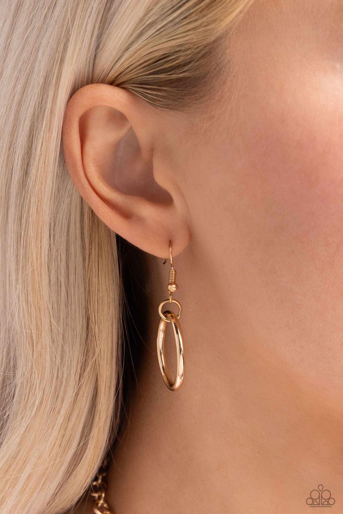 Smooth and serrated gold rings interlock below the collar for a bold statement. Features an adjustable clasp closure.