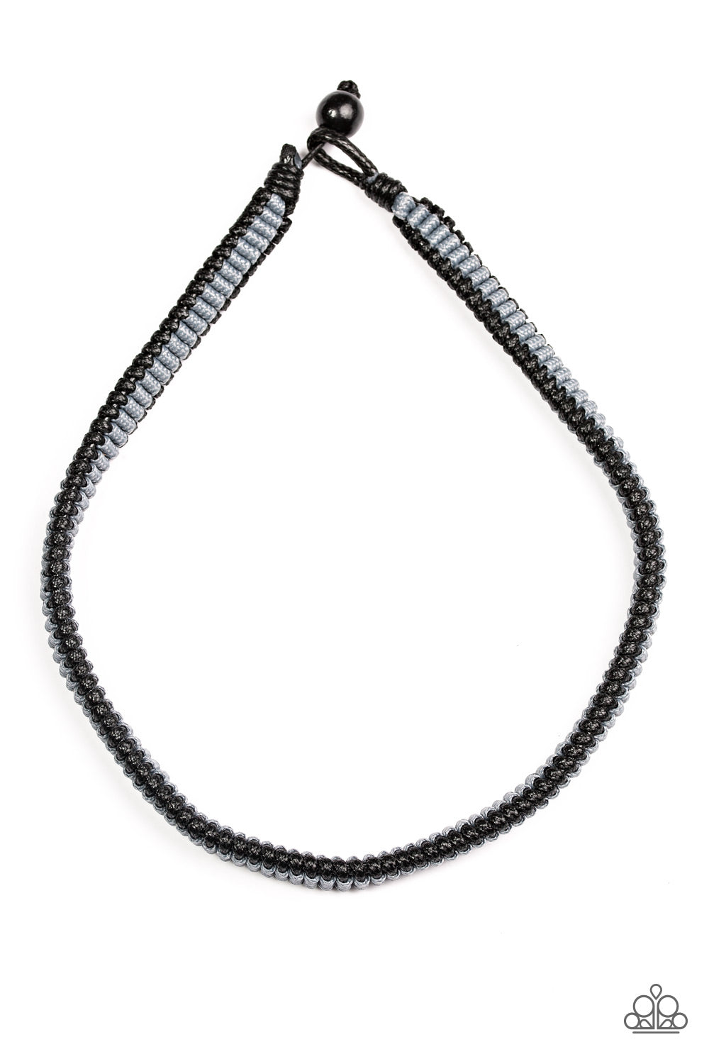 Black and gray cording weaves into a knotted braid below the collar for an urban look. Features a button loop closure.