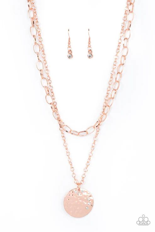 Sporadically dotted in glittery white rhinestones, an oversized hammered shiny copper disc is suspended from the lowermost of two mismatched shiny copper chains below the collar for a retro look. Features an adjustable clasp closure.