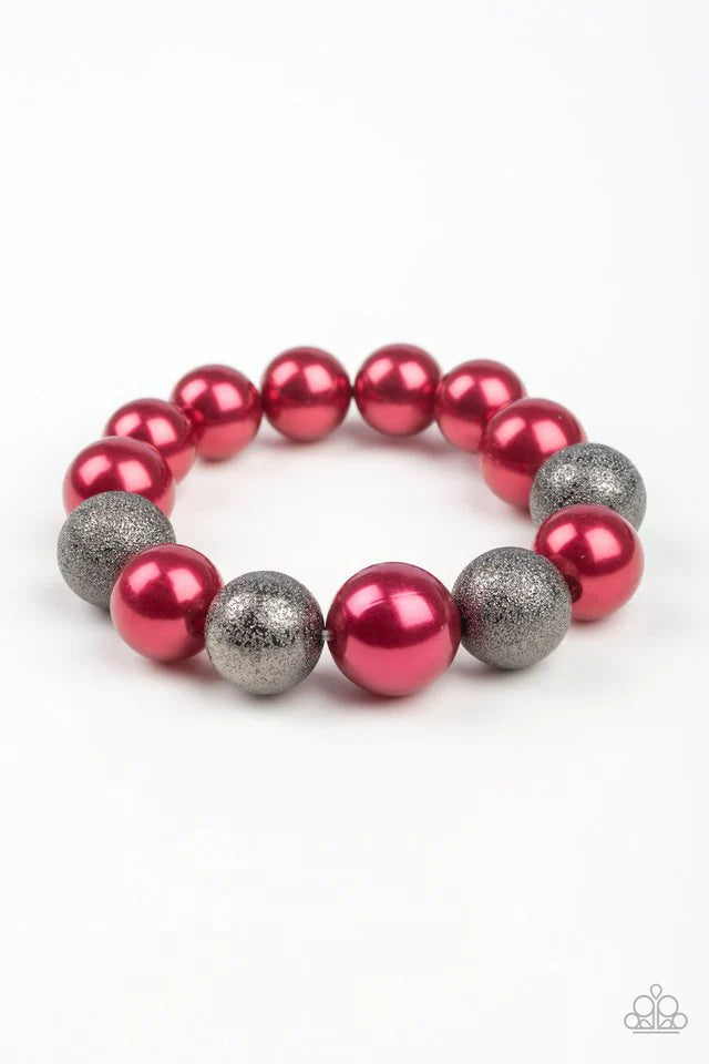 Dusted in glitter, sparkling gunmetal and pearly red beads are threaded along a stretchy band around the wrist for a glamorous look.
