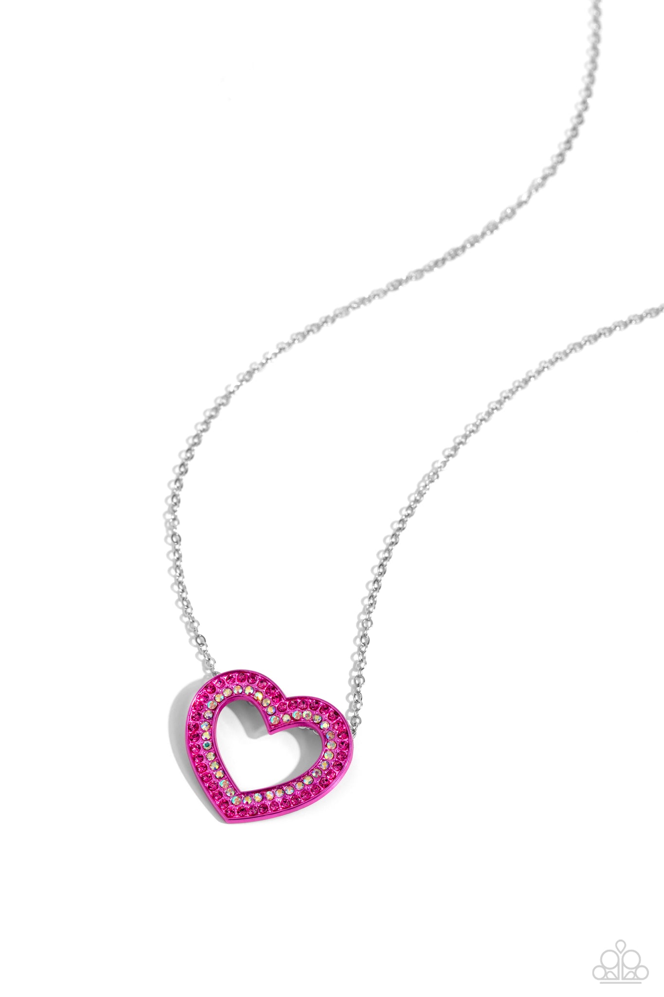Two rows of glassy fuchsia and iridescent rhinestones are encrusted along the front of a Pink Peacock heart frame that glides along a dainty silver chain, creating a flirty centerpiece. Features an adjustable clasp closure. Due to its prismatic palette, color may vary.