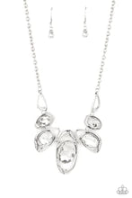 Dusted in sections of glassy white rhinestones, asymmetrical silver frames curl around oversized white gems below the collar. Varying in shape, the mismatched frames increase in size as they near the center for a hypnotizing finish. Features an adjustable clasp closure.