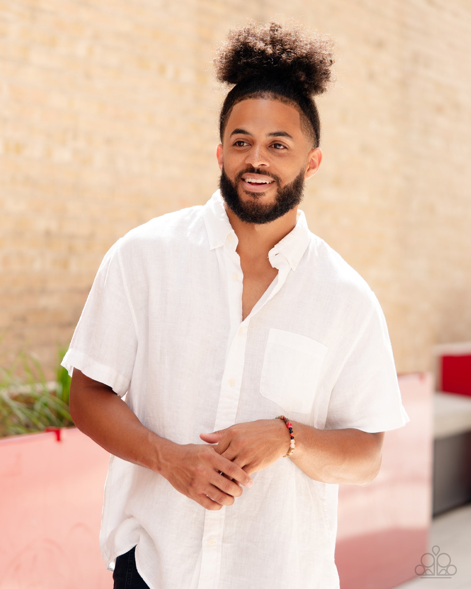 Infused along a stretchy band around the wrist, a strand of colorful glassy, stone, and acrylic beads joins a spotted collection of wood beads for a colorfully urban look. As the stone elements in this piece are natural, some color variation is normal.