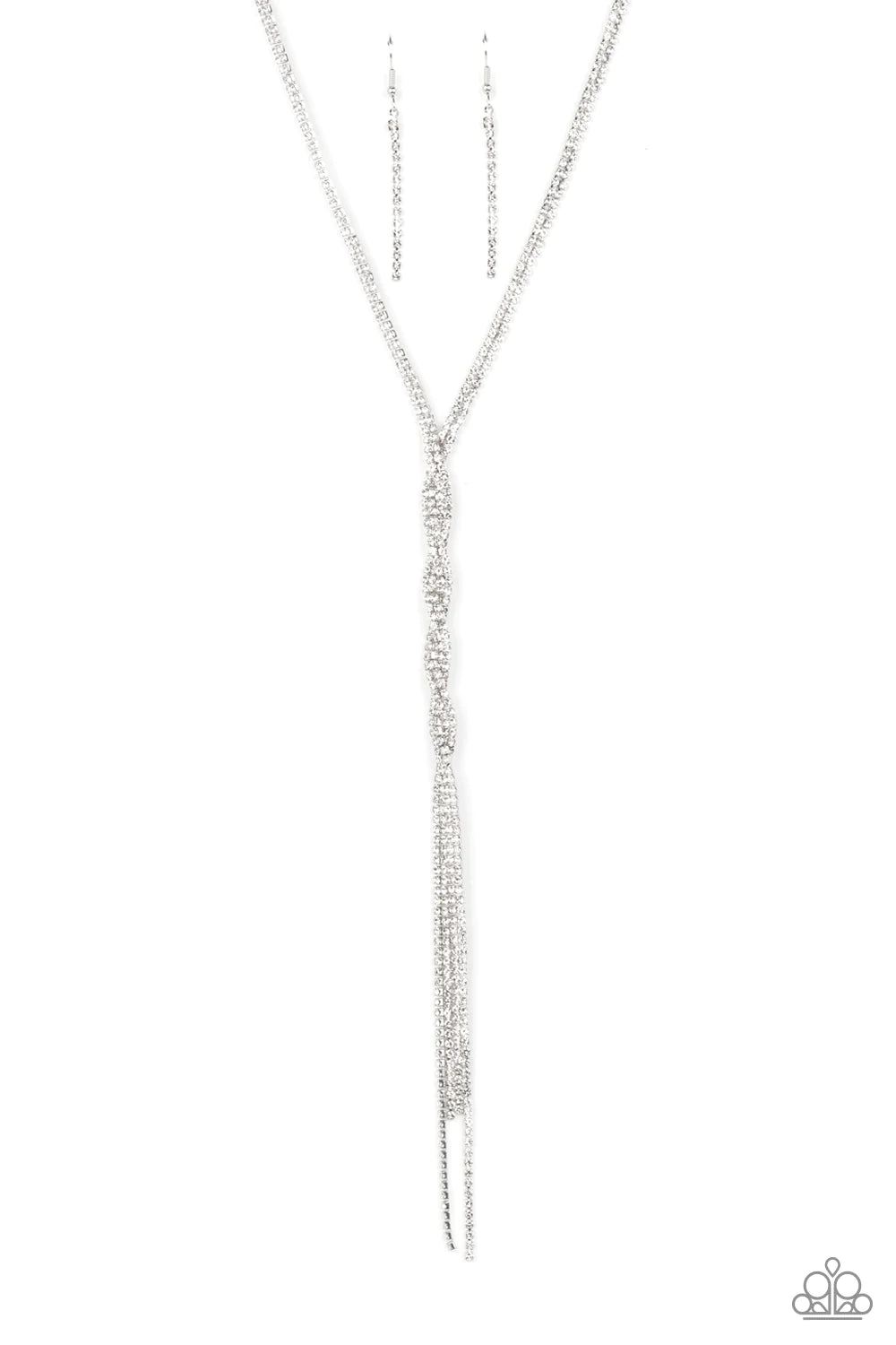 Silvery ribbons of glassy white rhinestones loop around the neck and delicately twist into an icy tassel down the chest. Features an adjustable clasp closure.