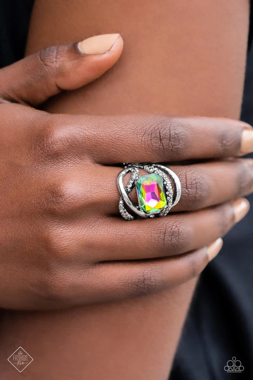 A pair of sleek silver bands — one dotted in hematite rhinestones — orbit around a radiant-cut, oil spill gem, for an edgy, three-dimensional centerpiece atop the finger. Features a stretchy band for a flexible fit. Due to its prismatic palette, color may vary.