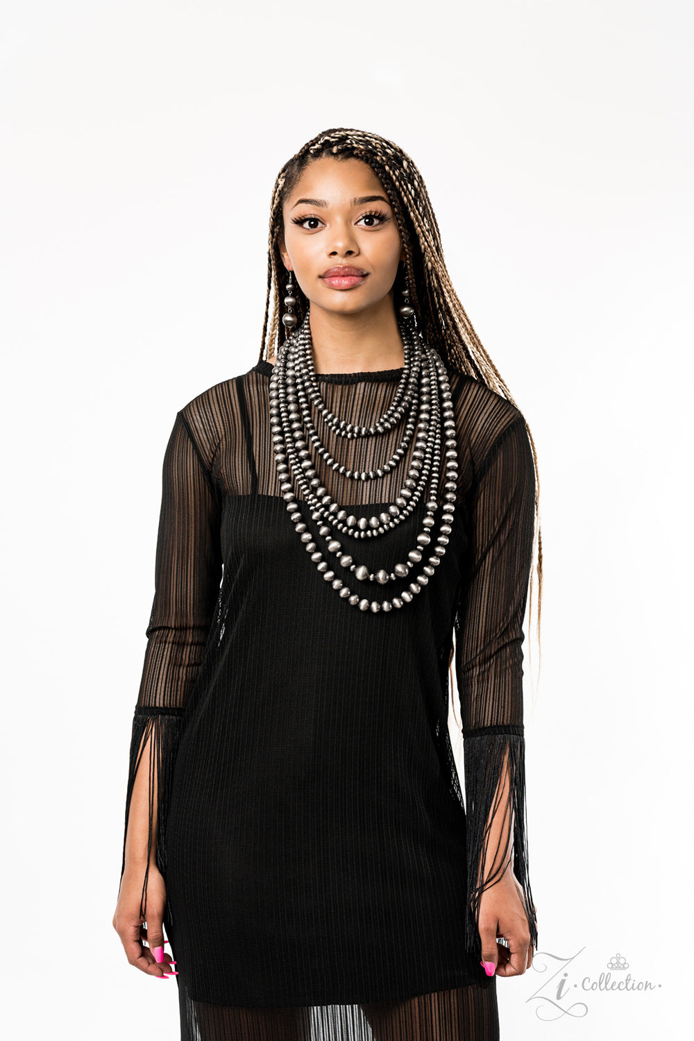 Strung between two silver fittings, row after row of hypnotizing gunmetal cat's eye beads cascade down the chest. The mesmerizing strands vary in size and pattern, creating haphazard layers of spellbinding shimmer. Features an adjustable clasp closure.