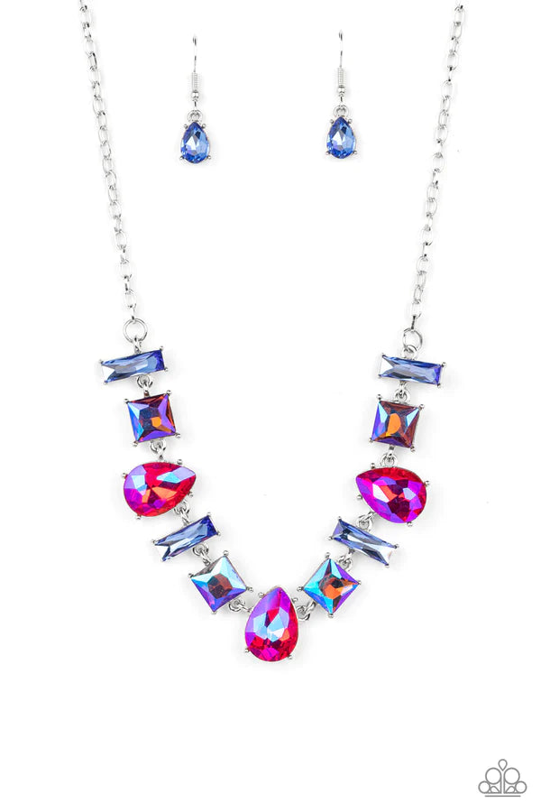 Featuring glassy, iridescent, and oil spill finishes, a mismatched collection of emerald cut blue, square multicolored, and teardrop pink gems delicately connects below the collar for a stellar statement. Features an adjustable clasp closure.