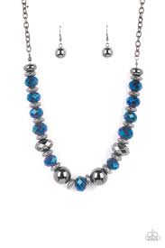 A dramatic assortment of oversized gunmetal beads, textured gunmetal rings, and faceted metallic blue gems delicately glides along an invisible wire below the collar, resulting in a stellar sparkle. Features an adjustable clasp closure.