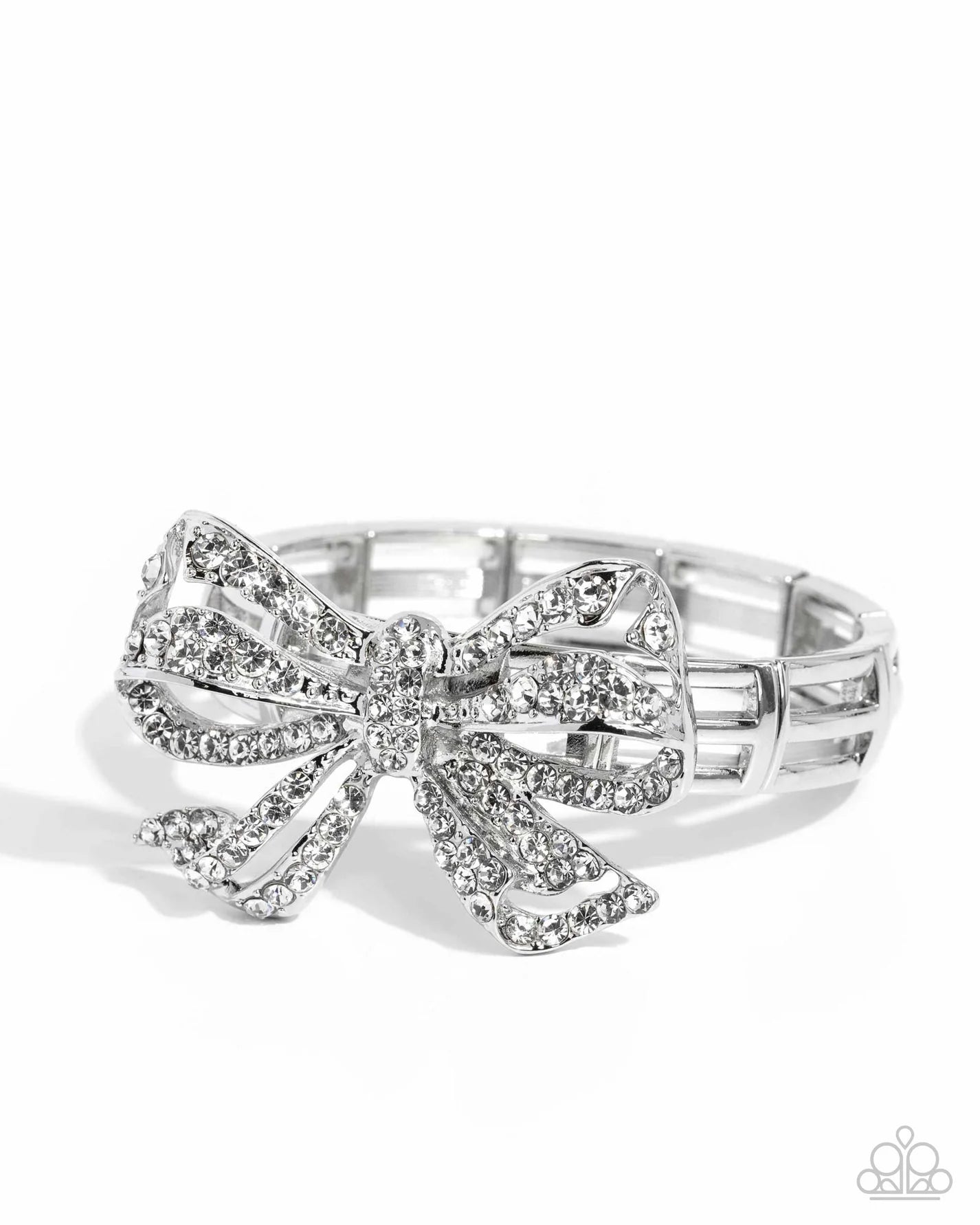 Infused along elastic stretchy bands, airy silver frames gleam along the wrist for a monochromatic display. Encrusted in white rhinestones, an oversized, airy silver bow glitters at the center of the design for a touch of class and refinement.