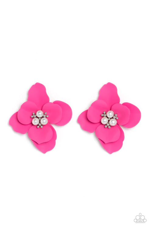 Blooming from a dainty white pearl and studded center, hot pink petals flare out around the ear in a delicate, airy manner for a feminine finish. Earring attaches to a standard post fitting.