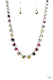 Spanning around the entirety of the neckline, a refined collection of colorful rhinestones are pressed into airy, studded, silver square frames, tilted on their sides for a three-dimensional shimmer. The frames and rhinestones gradually increase in size as they fall down the neckline, accentuating their colorful sparkle. Features an adjustable clasp closure.