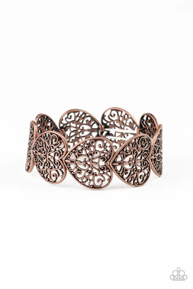 Filled with vine-like filigree, an antiqued collection of copper heart frames are delicately threaded along stretchy bands around the wrist for a romantically vintage look.