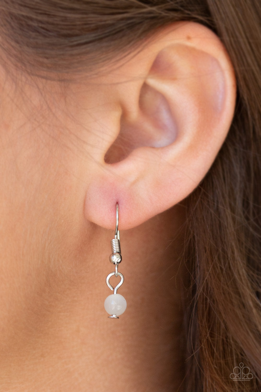 Shimmery silver hoops and glowing white moonstone beads connect into a whimsical chain across the chest. A lobster clasp hangs from the bottom of the design to allow a name badge or other item to be attached. Features an adjustable clasp closure.