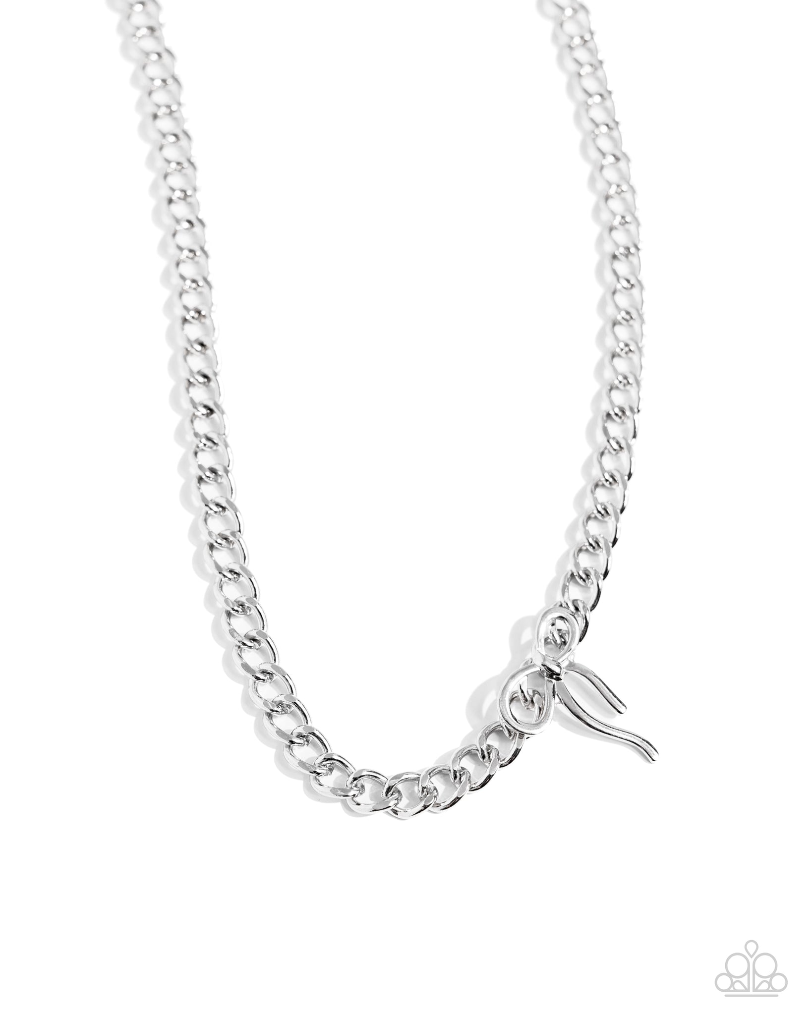 Featuring in the center of a high-sheen silver curb chain, a silver bow loops and curls below the neckline for a mismatched elegantly edgy display. Features an adjustable clasp closure.