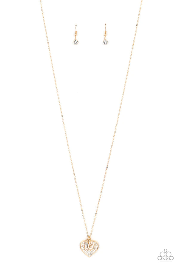 A gold heart frame brimming with brilliant dainty white rhinestones dangles from a lengthened dainty gold chain between two gold letter charms. The letter "I" is created from an emerald cut rhinestone framed in gold and the letter "U" is a simple gold bar bent into shape creating a lovely sentimental pendant. Features an adjustable clasp closure.
