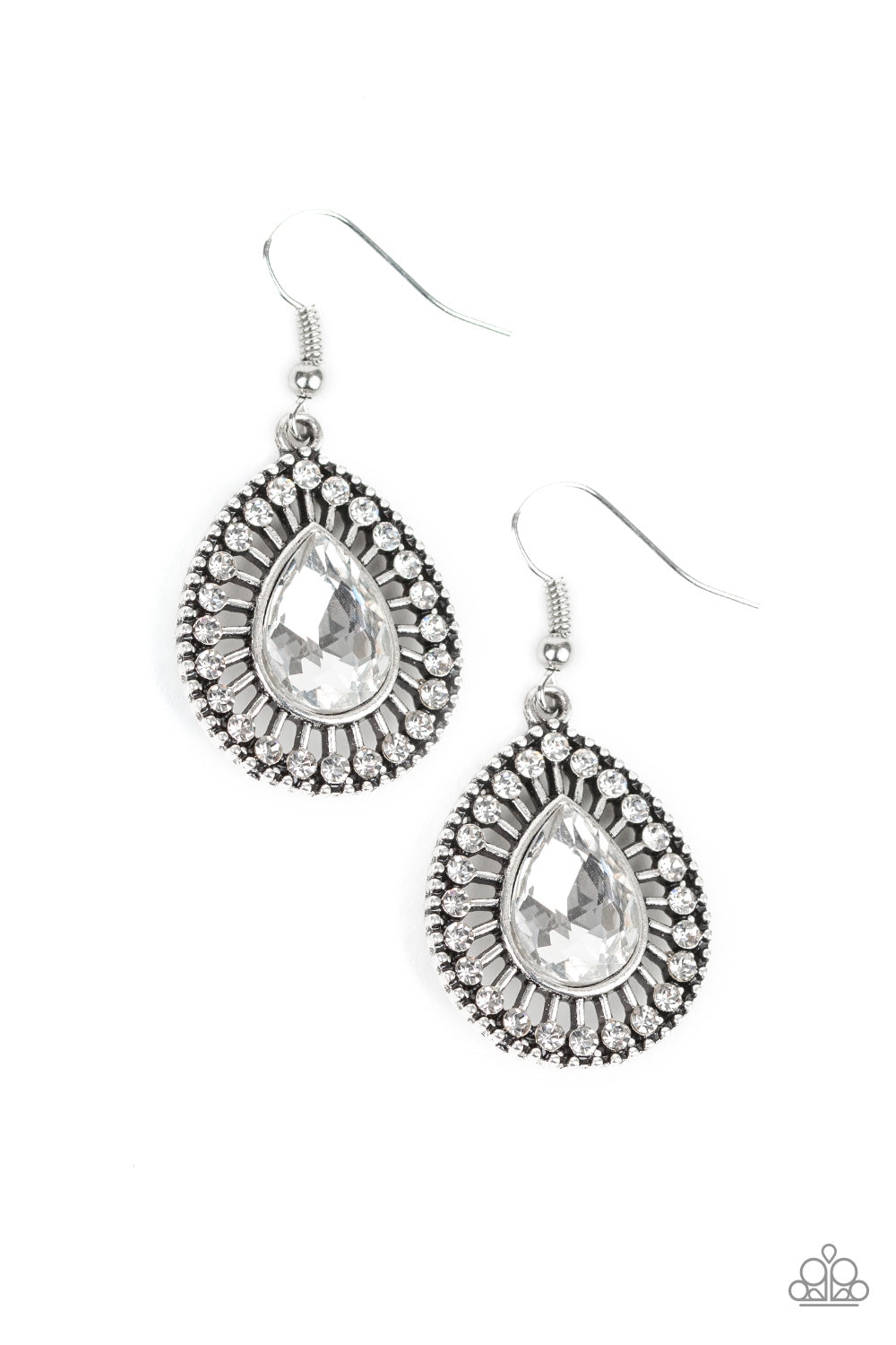 A teardrop white rhinestone is pressed into an ornate silver teardrop frame radiating with dainty white rhinestones for a refined flair. Earring attaches to a standard fishhook fitting.