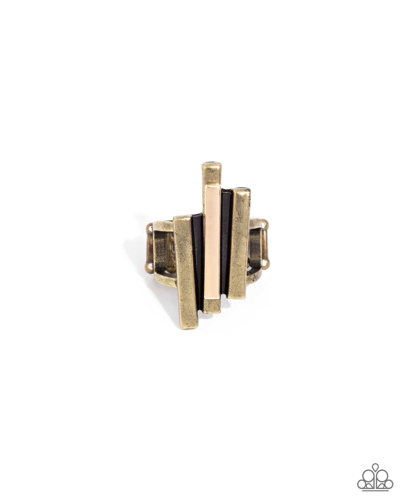 Sleek brass bars asymmetrically stack into an uneven band across the finger atop airy brass bands, resulting in an edgy fashion. An additional glistening gold bar is layered atop the centermost elongated brass bar for additional eye-catching detail. Features a stretchy band for a flexible fit.