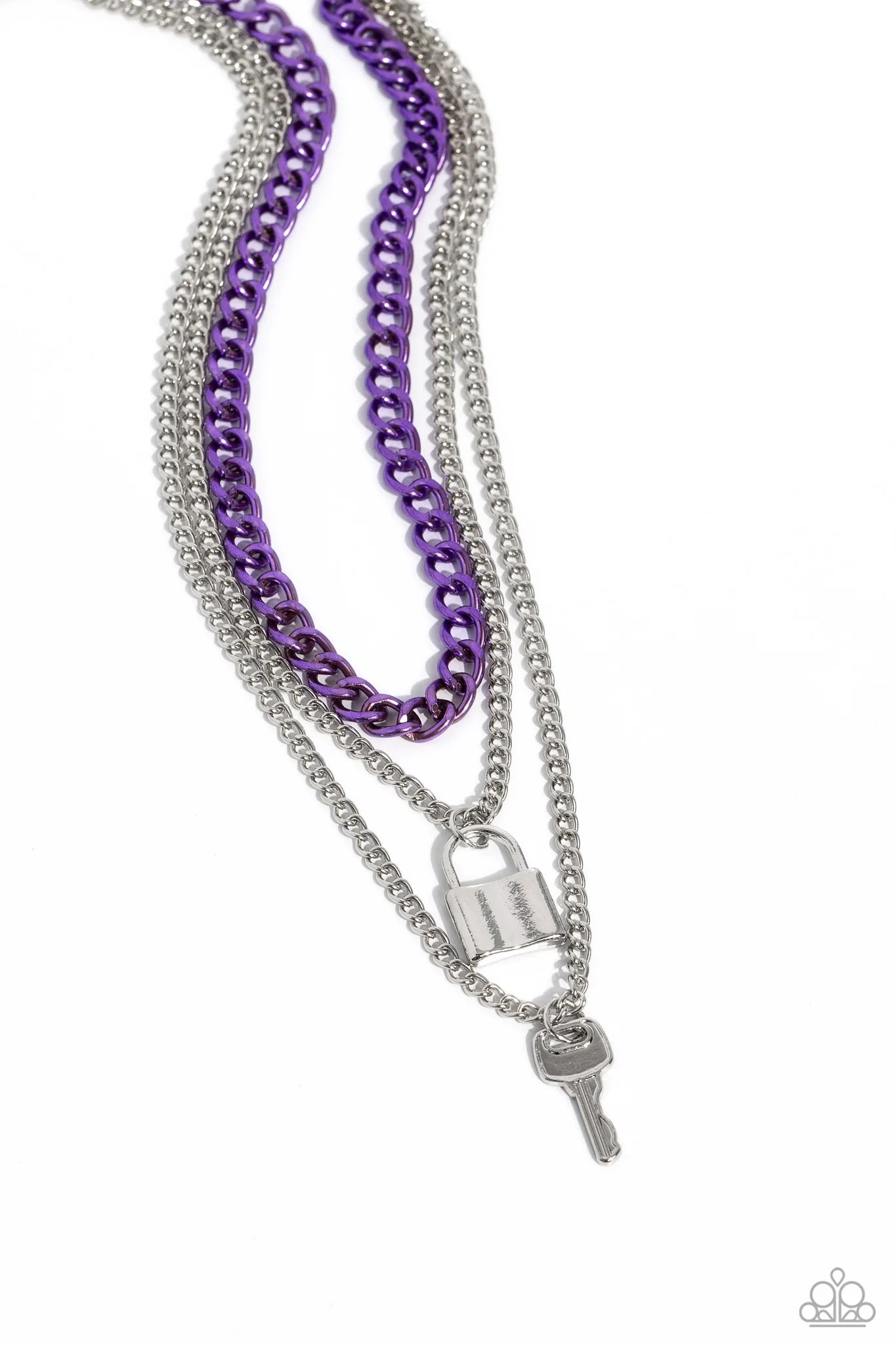 A sleek silver lock and silver key trickle from the bottoms of glistening silver chains down the chest, creating industrial layers. A purple curb chain hangs above the pendants for a touch of colorfully gritty sheen. Features an adjustable clasp closure.