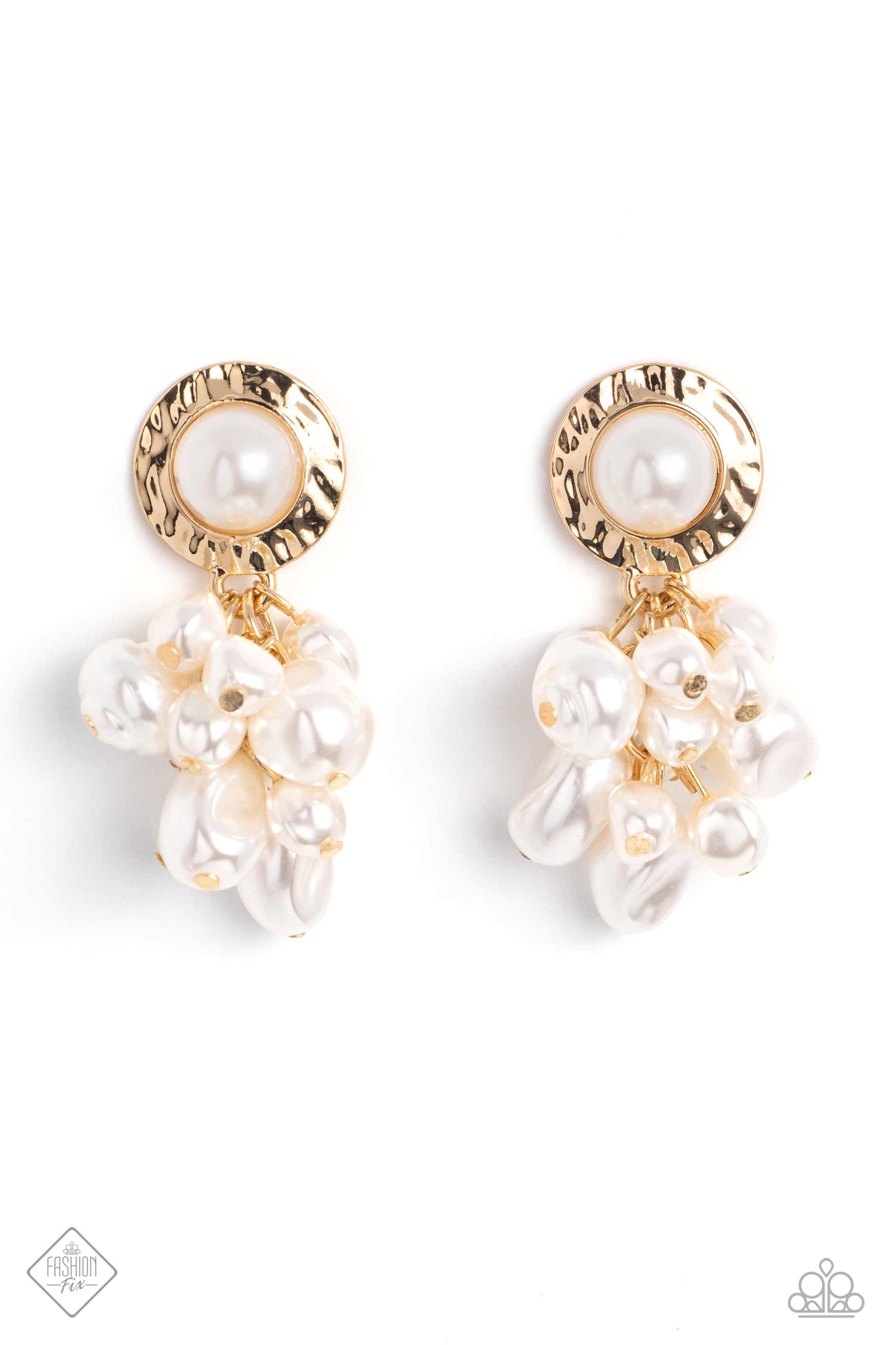 A glossy pearl dots the center of a hammered gold frame, rippling in tactile texture. Featuring imperfect finishes, a bubbly tassel of variegated baroque white pearls trickles from the bottom of the radiating frame for a touch of beachy refinement. Earring attaches to a standard post fitting.