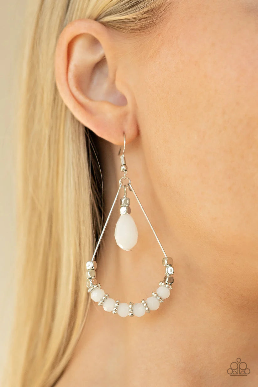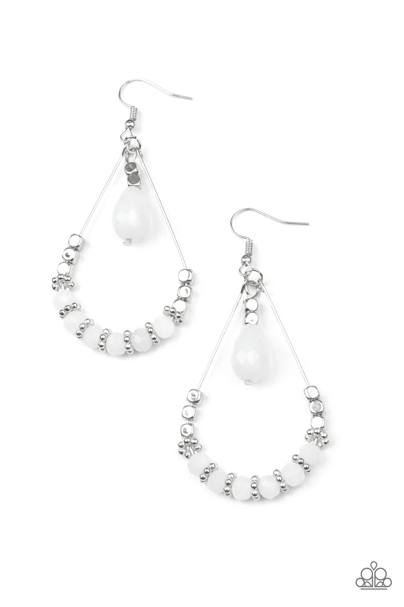 A dainty collection of studded silver rings, dewy white crystal-like beads, and shimmery silver cube beads are threaded along the bottom of a dainty wire teardrop. A matching silver cube beaded teardrop swings from the top of the airy frame for a whimsical finish. Earring attaches to a standard fishhook fitting.