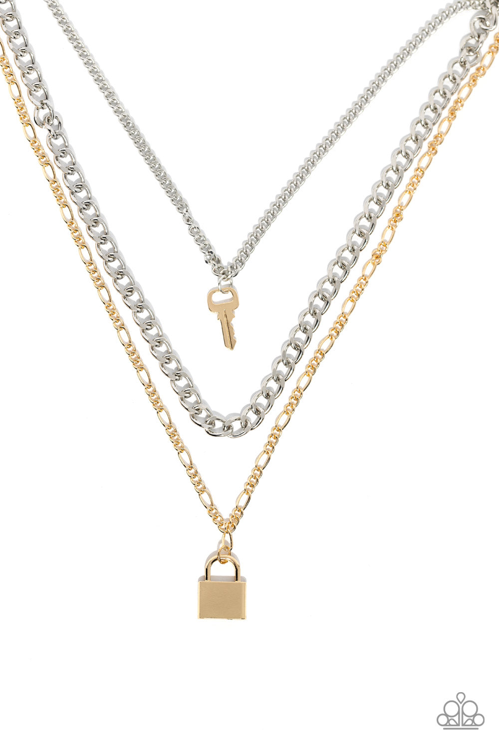 Three industrial silver and gold chains cascade in various lengths across the chest, creating a radiantly edgy display. The uppermost chain features a gold key charm, while a gold lock charm embellishes the lowermost chain creating a heavenly pendant at the bottom of the longest chain in a radiant finish. Features an adjustable clasp closure.